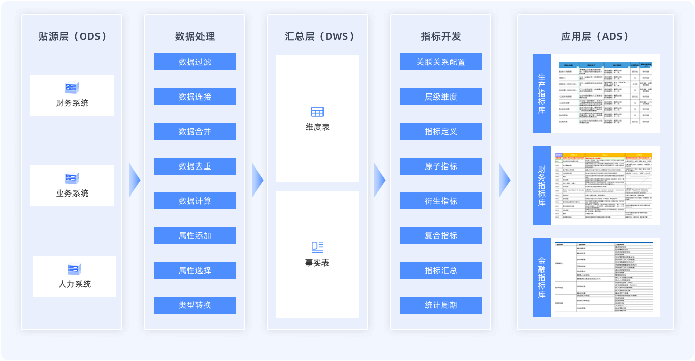 以數(shù)據(jù)資產(chǎn)整合與業(yè)務(wù)數(shù)字化管理為目標(biāo),構(gòu)建全業(yè)務(wù)鏈條的數(shù)據(jù)建模與指標(biāo)管理體系,整合多源數(shù)據(jù)構(gòu)建維度表與事實(shí)表,按“原子-衍生-復(fù)合”流程開(kāi)發(fā)指標(biāo)形成指標(biāo)庫(kù),依托平臺(tái)實(shí)現(xiàn)指標(biāo)全流程線上化與全生命周期管理。
