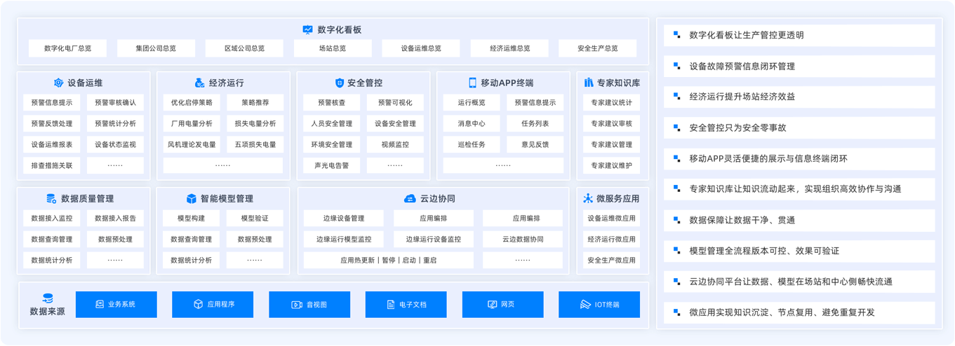 以“安全高效生產”為核心,以數(shù)字化為手段,穿透新能源電廠生產數(shù)據(jù),透視“人、機、料、法、環(huán)”與生產業(yè)務關系,實現(xiàn)設備高效運維、降低運營成本、強化安全風險管控,提高企業(yè)在電力市場中的競爭力。該方案已在多家電力龍頭企業(yè)落地應用,總計接入風電機組4萬余臺,光伏場站500余個,總裝機容量超過150GW。