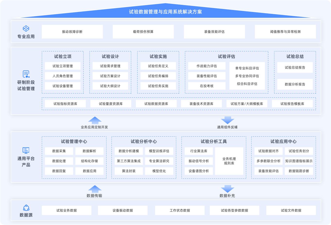 通過提供基于統(tǒng)一平臺的業(yè)務(wù)方案,可實現(xiàn)對試驗數(shù)據(jù)的統(tǒng)一采集、解析、管理與分析支持,并對各產(chǎn)品積累的試驗數(shù)據(jù)進行深層次挖掘,獲取性能、強度、效能等學(xué)科知識和規(guī)律,支持反饋至研發(fā)部門和承制部門,閉環(huán)改進產(chǎn)品設(shè)計、提高產(chǎn)品質(zhì)量可靠性,提升企業(yè)核心競爭力。