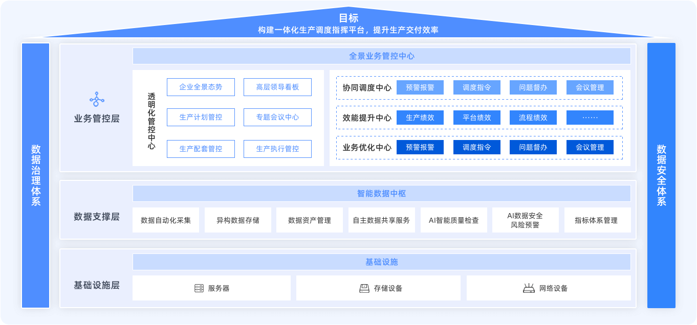 當(dāng)前粗放式的生產(chǎn)管理現(xiàn)狀,導(dǎo)致管理者難以全局掌控計劃執(zhí)行進度、及時識別解決各類異常,遑論均衡調(diào)度生產(chǎn)資源。亟需構(gòu)建一體化生產(chǎn)管控平臺,深度集成銷售至發(fā)運的主價值鏈,打通端到端數(shù)據(jù)驅(qū)動體系,實現(xiàn)需求、資源與生產(chǎn)的動態(tài)協(xié)同。以實現(xiàn)業(yè)務(wù)主價值鏈貫通、全局業(yè)務(wù)監(jiān)控、異常問題快速處置,從而提升企業(yè)整體生產(chǎn)管理水平,提升價值創(chuàng)造能力。